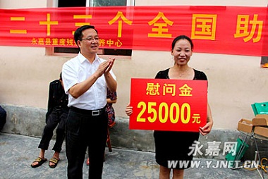 今年的 5月19是第23個(gè)全國(guó)助殘日,永嘉縣委副書記縣長(zhǎng)姜景峰率縣殘聯(lián)理事長(zhǎng)鄭文杰、縣委農(nóng)辦領(lǐng)導(dǎo)、和浙江優(yōu)機(jī)機(jī)械科技有限公司總經(jīng)理李珍武等專程到縣重度殘疾人托養(yǎng)中心、東城街道峙口村、長(zhǎng)源村慰問。